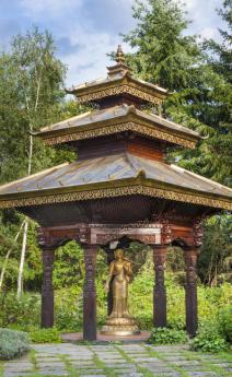 Im Osten schließt sich an den Rasen, getrennt durch einige Tsuga, ein 2008 neu angelegter Gartenteil an. Auf einer großen Lichtung gruppieren sich drei kleine Tempel um eine große